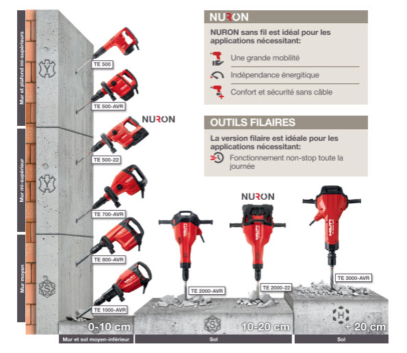 - Puissant burineur SDS Max (TE-Y) pour le burinage lourd dans le béton et la maçonnerie, équipé du système de réduction active des vibrations (AVR)