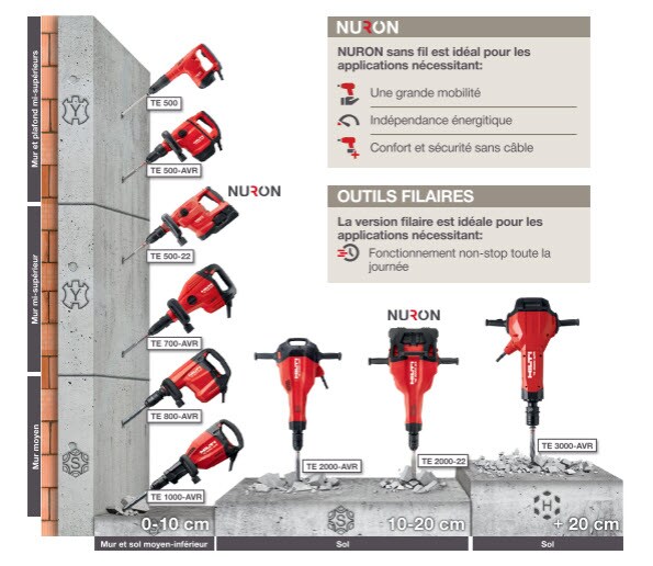 Découvrez notre gamme de burineurs pour travaux légers et intensifs, conçus pour réduire les vibrations et l’exposition à la poussière pendant les travaux de piquage, démolition et de retrait du béton