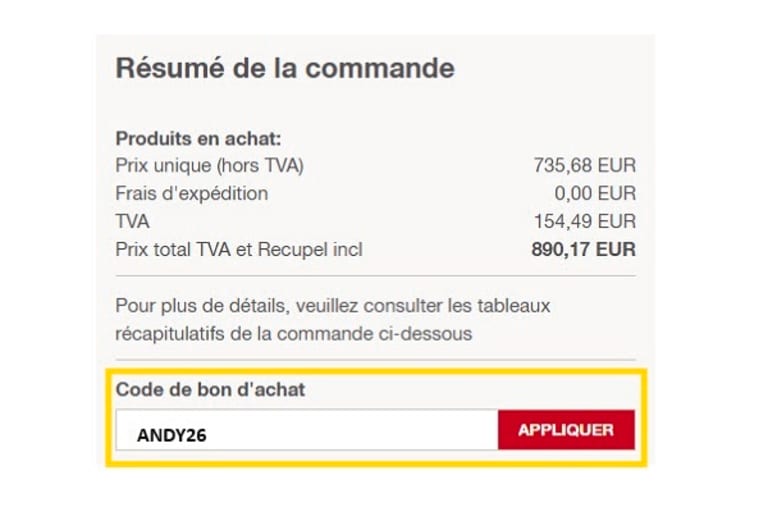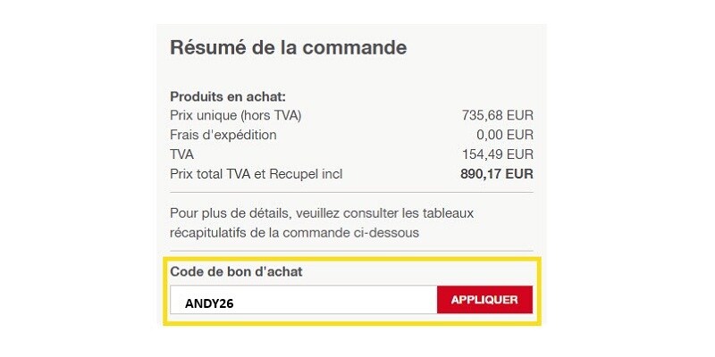 Validez votre panier et indiquez un mode de paiement. Dans le résumé de la commande, vous verrez un champ intitulé « Code bon d'achat ». Ajoutez le code de bon d'achat ANDY26 et cliquez sur le symbole "+" ou "appliquer".